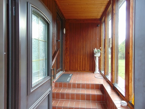 Außenwände: ISODUR-Wandelemente aus Polystirol-Hartschaum (Profil-Holz-Vertäfelung, PS-Hartschaum nach DIN 18164 Blatt 1, Holz-Vertäfelung), KG: 30 cm, Kalksandstein bündig gefugt