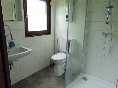 Sanitärinstallationen:ein Badezimmer mit Dusche, Waschbecken, WC.